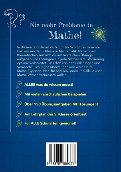 In diesem Buch lernst du Schritt für Schritt das gesamte Basiswissen der 5. Klasse in Mathematik. Neben dem theoretischen Teil wirst du mit zahlreichen Übungsaufgaben und Lösungen auf jede Mathe-Herausforderung optimal vorbereitet. Lass dich von den Erklärungen und Veranschaulichungen überzeugen und werde zum Mathe-Experten. Ideal für Schüler/-innen und alle, die ihr Mathe-Wissen verbessern wollen! => ALLES was du wissen musst! => Mit vielen anschaulichen Beispielen => Über 150 Übungsaufgaben MIT Lösungen! => Am Lehrplan der 5. Klasse orientiert => Für ALLE Schularten geeignet!