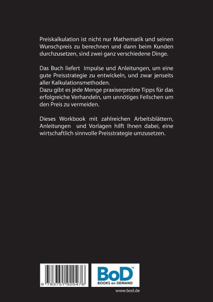 Preiskalkulation ist nicht nur Mathematik und seinen Wunschpreis zu berechnen und dann beim Kunden durchzusetzen, sind zwei ganz verschiedene Dinge.Das Buch liefert jede Menge Impulse und Anleitungen, eine gute Preisstrategie zu entwickeln, jenseits aller Kalkulationsmethoden.Dazu gibt es jede Menge praxiserprobte Tipps für das erfolgreiche Verhandeln, um unnötiges Feilschen um den Preis zu vermeiden.Das Workbook mit vielen Anleitungen, Arbeitsblättern und Vorlagen hilft dabei, Schritt für Schritt eine wirklich wirtschaftlich sinnvolle Preisstrategie umzusetzen.