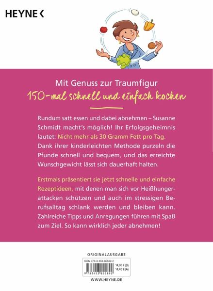 Rundum satt essen und dabei abnehmen Susanne Schmidt macht's möglich! Ihr Erfolgsgeheimnis lautet: Nicht mehr als 30 Gramm Fett pro Tag. Dank ihrer kinderleichten Methode purzeln die Pfunde schnell und bequem, und das erreichte Wunschgewicht lässt sich dauerhaft halten. Erstmals präsentiert sie jetzt schnelle und einfache Rezeptideen, mit denen man sich vor Heißhungerattacken schützen und auch im stressigen Berufsalltag schlank werden und bleiben kann. So kann wirklich jeder abnehmen.