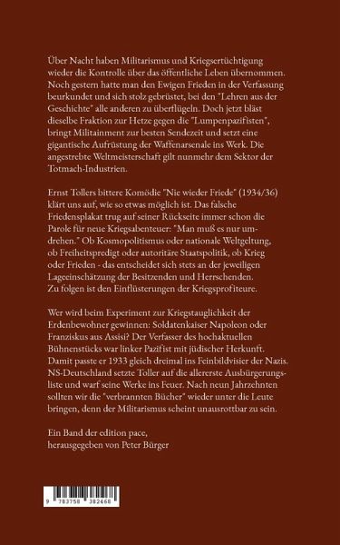 Über Nacht haben Militarismus und Kriegsertüchtigung wieder die Kontrolle über das öffentliche Leben übernommen. Noch gestern hatte man den Ewigen Frieden in der Verfassung beurkundet und sich stolz gebrüstet, bei den "Lehren aus der Geschichte" alle anderen zu überflügeln. Doch jetzt bläst dieselbe Fraktion zur Hetze gegen die "Lumpenpazifisten", bringt Militainment zur besten Sendezeit und setzt eine gigantische Aufrüstung der Waffenarsenale ins Werk. Die angestrebte Weltmeisterschaft gilt nunmehr dem Sektor der Totmach-Industrien.Ernst Tollers bittere Komödie "Nie wieder Friede" (1934/36) klärt uns auf, wie so etwas möglich ist. Das falsche Friedensplakat trug auf seiner Rückseite immer schon die Parole für neue Kriegsabenteuer: "Man muß es nur umdrehen." Ob Kosmopolitismus oder nationale Weltgeltung, ob Freiheitspredigt oder autoritäre Staatspolitik, ob Krieg oder Frieden - das entscheidet sich stets an der jeweiligen Lageeinschätzung der Besitzenden und Herrschenden. Zu folgen ist den Einflüsterungen der Kriegsprofiteure.Wer wird beim Experiment zur Kriegstauglichkeit der Erdenbewohner gewinnen: Soldatenkaiser Napoleon oder Franziskus aus Assisi? Der Verfasser des hochaktuellen Bühnenstücks war linker Pazifist mit jüdischer Herkunft. Damit passte er gleich dreimal ins Feindbildvisier der Nazis. 1933 setzte NS-Deutschland Toller auf die allererste Ausbürgerungsliste und warf seine Werke ins Feuer. Nach neun Jahrzehnten sollten wir die "verbrannten Bücher" wieder unter die Leute bringen, denn der Militarismus scheint unausrottbar zu sein.Zu den Beigaben dieser friedensbewegten Edition gehören acht Kapitel aus Tollers Autobiographie "Eine Jugend in Deutschland" (1933), der Schluß des Dramas "Hinkemann" (1923) und die Warnung des Schriftstellers vor dem deutschen Faschismus in der "Weltbühne" vom Oktober 1930.Ein Band der edition pace,herausgegeben von Peter Bürger