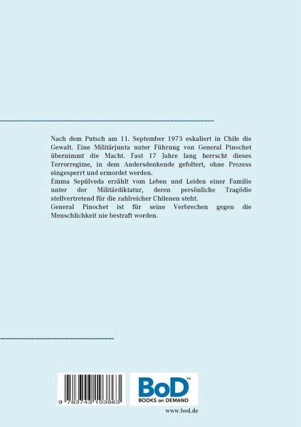 Nach dem Putsch am 11. September 1973 eskalierte in Chile die Gewalt. Eine Militärjunta unter Führung von General Pinochet übernahm die Macht. Fast 17 Jahre lang herrschte sein Terrorregime, in dem Andersdenkende gefoltert, ohne Prozess eingesperrt und ermordet wurden. Emma Sepúlveda erzählt vom Leben und Leiden einer Familie unter der Militärdiktatur, stellvertretend für die Tragödien zahlreicher Chilenen.Pinochet wurde für seine Verbrechen gegen die Menschlichkeit nie bestraft.