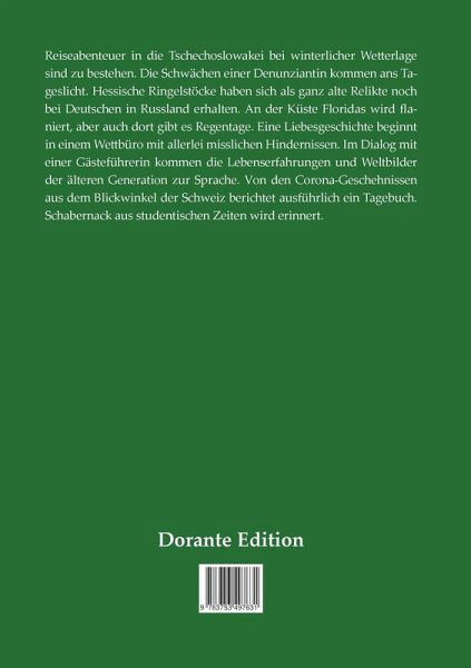 Reiseabenteuer in die Tschechoslowakei bei winterlicher Wetterlage sind zu bestehen. Die Schwächen einer Denunziantin kommen ans Tageslicht. Hessische Ringelstöcke haben sich als ganz alte Relikte noch bei Deutschen in Russland erhalten. An der Küste Floridas wird flaniert, aber auch dort gibt es Regentage. Eine Liebesgeschichte beginnt in einem Wettbüro mit allerlei misslichen Hindernissen. Im Dialog mit einer Gästeführerin kommen die Lebenserfahrungen und Weltbilder der älteren Generation zur Sprache. Von den Corona-Geschehnissen aus dem Blickwinkel der Schweiz berichtet ausführlich ein Tagebuch. Schabernack aus studentischen Zeiten wird erinnert.