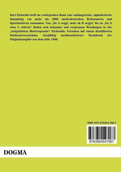 Karl Eichwald stellt im vorliegenden Band eine umfangreiche, alphabetische Sammlung von mehr als 2000 niederdeutschen Redensarten und Sprichwörtern zusammen. Von De A seggt, mutt ok B seggn bis zu En X vörn U schrivn finden sich bekannte und vergessene Wendungen in der vielgeliebten Muttersprache Eichwalds. Versehen mit einem detaillierten Stichwortverzeichnis. Sorgfältig nachbearbeiteter Nachdruck der Originalausgabe aus dem Jahr 1860.