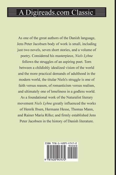 As one of the great authors of the Danish language, Jens Peter Jacobsen body of work is small, including just two novels, seven short stories, and a volume of poetry. Considered his masterpiece, "Niels Lyhne" follows the struggles of an aspiring poet. Torn between a childishly idealized vision of the world and the more practical demands of adulthood in the modern world, the titular Niels's struggle is one of faith versus reason, of romanticism versus realism, and ultimately one of loneliness in a godless world. As a foundational work of the Naturalist literary movement "Niels Lyhne" greatly influenced the works of Henrik Ibsen, Hermann Hesse, Thomas Mann, and Rainer Maria Rilke; and firmly established Jens Peter Jacobsen in the history of Danish literature.