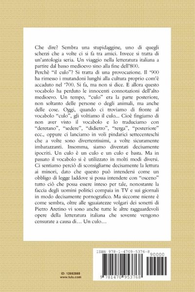 Il titolo di questa antologia è una provocazione: quanti testi della narrativa italiana vengono "omessi" dalle antologie per la semplice presenza di termini considerati "sconvenienti"? Questa antologia riporta testi anche fondamentali della letteratura italiana ma selezionati grazie alla presenza al loro interno del vocabolo "culo", in tutte le sue accezioni (non solo quella, ben nota, dell'appendice animale). Non mancano ovviamente i brani più censurati, ma certamente il lettore sarà sorpreso di quanti illustri autori hanno citato nelle loro opere questo vituperato vocabolo. Una antologia seria ricca di testi importanti, più o meno conosciuti, ma anche di quasi sconosciuti, divertentissimi sonetti. Una raccolta da ridere e da non ridere, tra il serio e il faceto. Da Dante a Leopardi passando per i sonetti romaneschi del Belli, una antologia tutta da gustare.