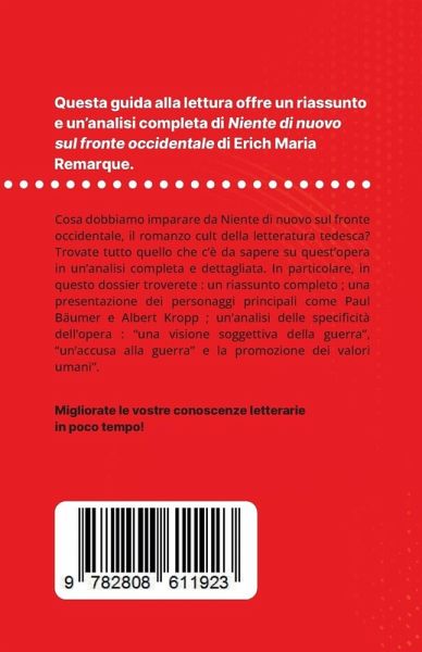 Cosa dobbiamo imparare da Niente di nuovo sul fronte occidentale, il romanzo cult della letteratura tedesca? Trovate tutto quello che c'è da sapere su quest'opera in un'analisi completa e dettagliata. In particolare, in questo dossier troverete: - Un riassunto completo - Una presentazione dei personaggi principali come Paul Bäumer e Albert Kropp - Un'analisi delle specificità dell'opera: una visione soggettiva della guerra, un'accusa alla guerra, la promozione dei valori umani Un'analisi di riferimento per comprendere rapidamente il significato dell'opera.