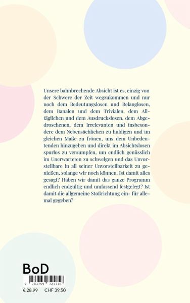 Unsere bahnbrechende Absicht ist es, einzig von der Schwere der Zeit wegzukommen und nur noch dem Bedeutungslosen und Belanglosen, dem Banalen und dem Trivialen, dem Alltäglichen und dem Ausdruckslosen, dem Abgedroschenen und dem Irrelevanten, dem Alltäglichen und insbesondere dem Nebensächlichen zu huldigen und im gleichen Maße zu frönen, uns dem Unbedeutenden hinzugeben und direkt im Absichtslosen spurlos zu versumpfen, endlich genüsslich im Unerwarteten zu schwelgen und das Unvorstellbare in all seiner Unvorstellbarkeit zu genießen, solange wir noch können. Ist damit alles gesagt? Haben wir damit das Programm endlich endgültig und umfassend festgelegt? Ist damit die allgemeine Stoßrichtung ein- für allemal gegeben?