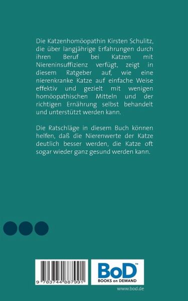 Die Katzenhomöopathin Kirsten Schulitz, die über langjährige Erfahrungen durch ihren Beruf bei Katzen mit Niereninsuffizienz verfügt, zeigt in diesem Ratgeber auf, wie eine nierenkranke Katze auf einfache Weise effektiv und gezielt mit wenigen homöopathischen Mitteln und der richtigen Ernährung selbst behandelt und unterstützt werden kann. Die Ratschläge in diesem Buch können helfen, dass die Nierenwerte der Katze deutlich besser werden, die Katze oft sogar wieder ganz gesund werden kann.