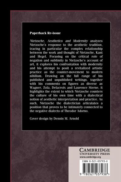 Nietzsche, Aesthetics and Modernity analyses Nietzsche's response to the aesthetic tradition, tracing in particular the complex relationship between the work and thought of Nietzsche, Kant and Hegel. Focusing in particular on the critical role of negation and sublimity in Nietzsche's account of art, it explores his confrontation with modernity and his attempt to posit a revitalized artistic practice as the counter-movement to modern nihilism. Drawing on the full range of his published and unpublished writings, together with his comments on figures as diverse as Wagner, Zola, Delacroix and Laurence Sterne, it highlights the extent to which Nietzsche counters the culture of his own time with a dialectical notion of aesthetic interpretation and practice. As such, Nietzsche the dialectician articulates a position that proves to be intimately connected to the negative dialects of Theodor Adorno.
