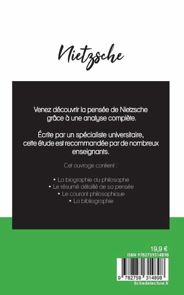 Venez découvrir la pensée de Nietzsche grâce à une analyse philosophique de référence ! Écrite par un spécialiste universitaire, cette étude est recommandée par de nombreux enseignants. Cet ouvrage contient notamment la biographie du philosophe, le résumé détaillé de sa pensée, ainsi que l'analyse de son courant philosophique. Retrouvez tous nos titres sur : www.fichedelecture.fr.