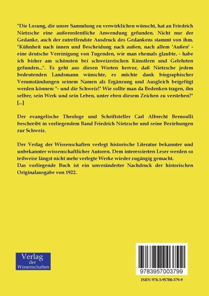 Der evangelische Theologe und Schriftsteller Carl Albrecht Bernoulli beschreibt in vorliegendem Band Friedrich Nietzsche und seine Beziehungen zur Schweiz.
