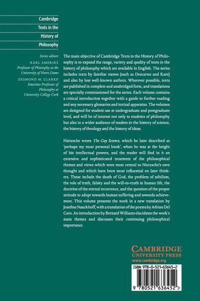 Nietzsche wrote The Gay Science, which he later described as 'perhaps my most personal book', when he was at the height of his intellectual powers, and the reader will find in it an extensive and sophisticated treatment of the philosophical themes and views which were most central to Nietzsche's own thought and which have been most influential on later thinkers. These include the death of God, the problem of nihilism, the role of truth, falsity and the will-to-truth in human life, the doctrine of the eternal recurrence, and the question of the proper attitude to adopt toward human suffering and toward human achievement. This volume presents the work in a new translation by Josefine Nauckhoff, with an introduction by Bernard Williams that elucidates the work's main themes and discusses their continuing philosophical importance.