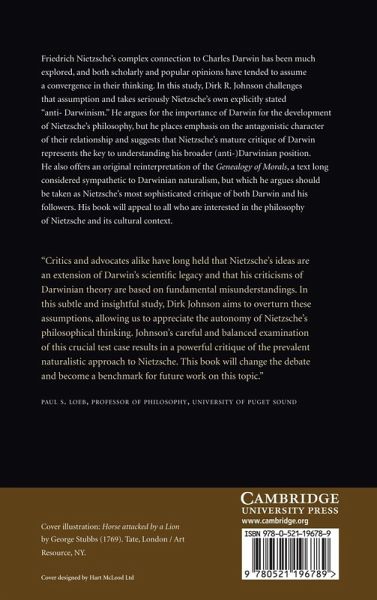 Friedrich Nietzsche's complex connection to Charles Darwin has been much explored, and both scholarly and popular opinions have tended to assume a convergence in their thinking. In this study, Dirk Johnson challenges that assumption and takes seriously Nietzsche's own explicitly stated 'anti-Darwinism'. He argues for the importance of Darwin for the development of Nietzsche's philosophy, but he places emphasis on the antagonistic character of their relationship and suggests that Nietzsche's mature critique against Darwin represents the key to understanding his broader (anti-)Darwinian position. He also offers an original reinterpretation of the Genealogy of Morals, a text long considered sympathetic to Darwinian naturalism, but which he argues should be taken as Nietzsche's most sophisticated critique of both Darwin and his followers. His book will appeal to all who are interested in the philosophy of Nietzsche and its cultural context.