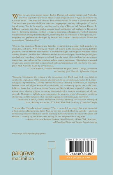"LaMothe's succulent attention to the phenomenology of dance technique draws persuasive power from beyond the writing itself. Nietzsche's Dancers is not only a study in the recreation of religious values; it is an expression of the bodily conditions it explores. And, in this regard, the joyous engagement expressed on every page refers readers to lived practices of kinetic fluency as the basis for affirmation of life." - Journal of the American Academy of Religion"Strangely, Christianity, the religion of the incarnation - the 'Word made flesh' - has failed to develop the implications of the intimate relationship between incarnation and dance. In this fascinating and important book, LaMothe addresses Christianity's hostility toward dance, an opposition between dance and religion reinforced by scholarship that consistently ignores one or the other. LaMothe shows that the dancers Isadora Duncan and Martha Graham responded to Nietzsche's advocacy for a 'dancing religion' by creating dances designed to 'catalyze a renaissance of religion, especially Christianity.' LaMothe argues passionately for awareness of the 'physiological conditions of meaning,' and the realization of an incarnation grounded in breathing and movement." - Margaret R. Miles, Emerita Professor of Historical Theology, The Graduate Theological Union, Berkeley, and author of The Word Made Flesh: A History of Christian Thought
