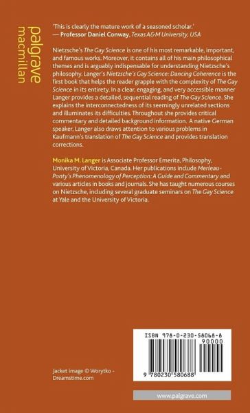 MONIKA M. LANGER is Associate Professor Emerita, Philosophy, University of Victoria, Canada. Her publications include Merleau-Ponty's Phenomenology of Perception: A Guide and Commentary and various articles in books and journals. She has taught numerous courses on Nietzsche, including several graduate seminars on The Gay Science at Yale and the University of Victoria