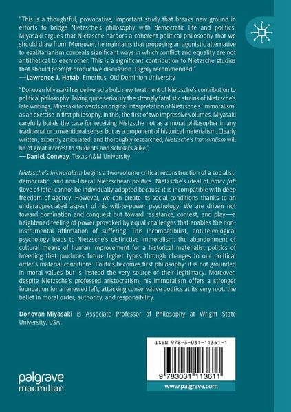 Nietzsche's Immoralism begins a two-volume critical reconstruction of a socialist, democratic, and non-liberal Nietzschean politics. Nietzsche's ideal of amor fati (love of fate) cannot be individually adopted because it is incompatible with deep freedom of agency. However, we can create its social conditions thanks to an underappreciated aspect of his will-to-power psychology. We are driven not toward domination and conquest but toward resistance, contest, and play-a heightened feeling of power provoked by equal challenges that enables the non-instrumental affirmation of suffering. This incompatibilist, anti-teleological psychology leads to Nietzsche's distinctive immoralism: the abandonment of cultural means of human improvement for a historical materialist politics of breeding that produces future higher types through changes to our political order's material conditions. Politics becomes first philosophy: it is not grounded in moral values but is instead the very source oftheir legitimacy. Moreover, despite Nietzsche's professed aristocratism, his immoralism offers a stronger foundation for a renewed left, attacking conservative politics at its very root: the belief in moral order, authority, and responsibility.