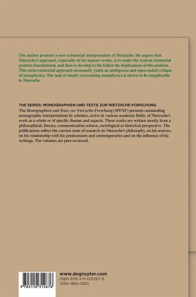 Vinod Acharya presents a new existential interpretation of Nietzsche's philosophy. He contends that Nietzsche's peculiar form of existentialism can be understood only by undertaking a thorough analysis of his characterization and critique of metaphysics. This reading remedies the shortcomings of previous existential interpretations of Nietzsche, which typically view existentialism as concerned primarily with the meaning of individual existence, and therefore necessarily at odds with the abstraction and objectivity of metaphysical thought. Acharya argues that the approach of Nietzsche's philosophy, especially in his mature works, is to make the typical existential position foundational, and then to develop to the fullest the implications of this position. This meta-existential approach necessarily yields an ambiguous and open-ended critique of metaphysics. Taking issue with the Heideggerian, the poststructuralist, and the naturalistic interpretations, this book contends that Nietzsche neither simply overcomes metaphysics nor remains trapped within its confines. Acharya argues that an ever-renewed encounter with and critique of metaphysics is an essential aspect of Nietzsche's meta-existentialism.
