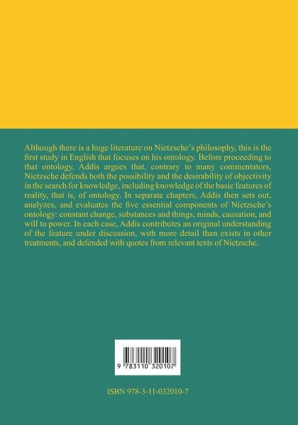 Although there is a huge literature on Nietzsche's philosophy, this is the first study in English that focuses on his ontology. Before proceeding to that ontology, Addis argues that, contrary to many commentators, Nietzsche defends both the possibility and the desirability of objectivity in the search for knowledge, including knowledge of the basic features of reality, that is, of ontology. In separate chapters, Addis then sets out, analyzes, and evaluates the five essential components of Nietzsche's ontology: constant change, substances and things, minds, causation, and will to power. In each case, Addis contributes an original understanding of the feature under discussion, with more detail than exists in other treatments, and defended with quotes from relevant texts of Nietzsche.