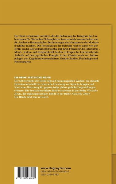Der Band versammelt Aufsätze, die die Bedeutung der Kategorie des Unbewussten für Nietzsches Philosophieren facettenreich herausarbeiten und für Analysen dilemmatischer Bestimmungen des Humanen in der Moderne fruchtbar machen. Die Perspektiven der Beiträge reichen dabei von der Kritik an der Bewusstseinsphilosophie mit ihren Folgen für die Erkenntnis-, Moral-, Kultur- und Religionskritik bis hin zu Fragen der Literaturtheorie, Ästhetik und den psychischen Energien in den Künsten sowie zur Anthropologie, den Kognitionswissenschaften, Gender-Studies, zur Psychologie und Psychoanalyse.