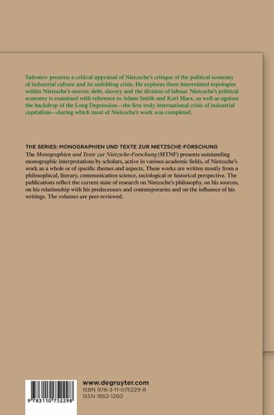 Safronov's Nietzsche's Political Economy is a pioneering appraisal of Nietzsche's critique of industrial culture and its unfolding crisis. The author contends that Nietzsche remains unique in conceptualizing the upheavals of modern political economy in terms of the crisis of its governing values. Nietzsche scrutinises the norms which, not only preside over the unfathomable build-up in debt, the proliferation of meaningless, impersonal slavery and the rise of increasingly repressive social control systems, but inevitably set these precarious tendencies of modern political economy on a collision course liable to culminate in an unprecedented human and environmental catastrophe. Safronov explores the core themes of Nietzsche's political economy-debt, slavery, and the division of labour-with reference to the influential views of Adam Smith and Karl Marx, as well as against the backdrop of the Long Depression (1873-1896), the first truly international crisis of industrial capitalism, during which most of Nietzsche's work was completed.