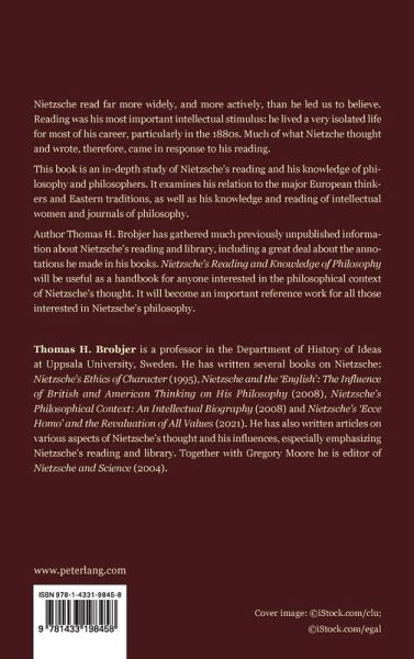 Author Thomas H. Brobjer has gathered much previously unpublished information about Nietzsche's reading and library, including a great deal about the annotations he made in his books. Nietzsche's Reading and Knowledge of Philosophy will be useful as a handbook for anyone interested in the philosophical context of Nietzsche's thought. It will become an important reference work for all those interested in Nietzsche's philosophy.