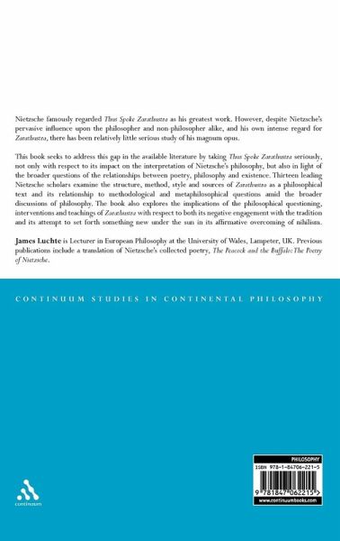 Nietzsche famously regarded Thus Spoke Zarathustra as his greatest work. However, despite Nietzsche's pervasive influence upon the philosopher and non-philosopher alike, and his own intense regard for Zarathustra, there has been relatively little serious study of Nietzsche's magnum opus. This book seeks to address this gap in the available literature by taking Thus Spoke Zarathustra seriously, not only with respect to its impact on the interpretation of Nietzsche's philosophy, but also in light of the broader questions of the relationships between poetry, philosophy and existence. Fifteen leading Nietzsche scholars examine the structure, method, style and sources of Zarathustra as a philosophical text and its relationship to methodological and metaphilosophical questions amid the broader discussions of philosophy. The book also explores the implications of the philosophical questioning, interventions and teachings of Zarathustra with respect to both its negative engagement with the tradition and its attempt to set forth something new under the sun in its affirmative overcoming of nihilism.