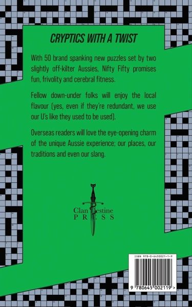 Cryptics with a twist. With 50 brand spanking new puzzles set by two slightly off-kilter Aussies, Nifty Fifty promises fun, frivolity and cerebral fitness. Fellow down-under folks will enjoy the local flavour (yes, even if they're redundant, we use our U's like they used to be used). Overseas readers will love the eye-opening charm of the unique Aussie experience; our places, our traditions and even our slang.