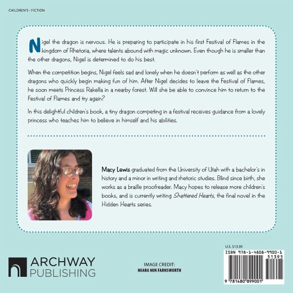 Nigel the dragon is nervous. He is preparing to participate in his first Festival of Flames in the kingdom of Rhetoria, where talents abound with magic unknown. Even though he is smaller than the other dragons, Nigel is determined to do his best. When the competition begins, Nigel feels sad and lonely when he doesn't perform as well as the other dragons who quickly begin making fun of him. After Nigel decides to leave the Festival of Flames, he soon meets Princess Rakella in a nearby forest. Will she be able to convince him to return to the Festival of Flames and try again? In this delightful children's book, a tiny dragon competing in a festival receives guidance from a lovely princess who teaches him to believe in himself and his abilities.