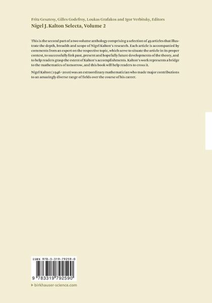 This is the second part of a two volume anthology comprising a selection of 49 articles that illustrate the depth, breadth and scope of Nigel Kalton's research. Each article is accompanied by comments from an expert on the respective topic, which serves to situate the article in its proper context, to successfully link past, present and hopefully future developments of the theory and to help readers grasp the extent of Kalton's accomplishments. Kalton's work represents a bridge to the mathematics of tomorrow, and this book will help readers to cross it.