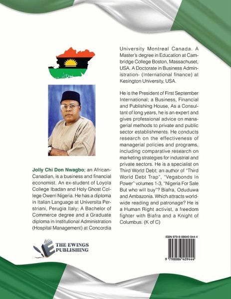 Jolly Chi Don Nwagbo; an African Canadian, is a business and financial economist. An ex-student of Loyola College Ibadan and Holy Ghost College Owerri Nigeria. He has a diploma in Italian Language at Universita Perstrain, Perugia Italy; A Bachelor of Commerce degree, and a Graduate diploma in Institutional Administration (Hospital Management) at Concordia University Montreal Canada. A Master's degree in Education at Cam[1]bridge College Boston, Massachusetts, USA. A Doctorate in Business Administration- (International finance) at Kensington University, USA. He is the President of First September International; a Business, Financial and Publishing House, As a Consultant of long years, he is an expert and gives professional advice on managerial methods to private and public sector establishments. He conducts research on the effectiveness of managerial policies and programs, including comparative research on marketing strategies for industrial and private sectors. He is a specialist on Third World Debt; an author of "Third World Debt Trap", "Vegabonds In Power" volumes 1-3, "Nigeria For Sale But who will buy"? Biafra, Oduduwa and Ambazonia. Which attracts worldwide reading and patronage? He is a Human Right activist, a freedom fighter with Biafra and a Knight of Columbus. (K of C)