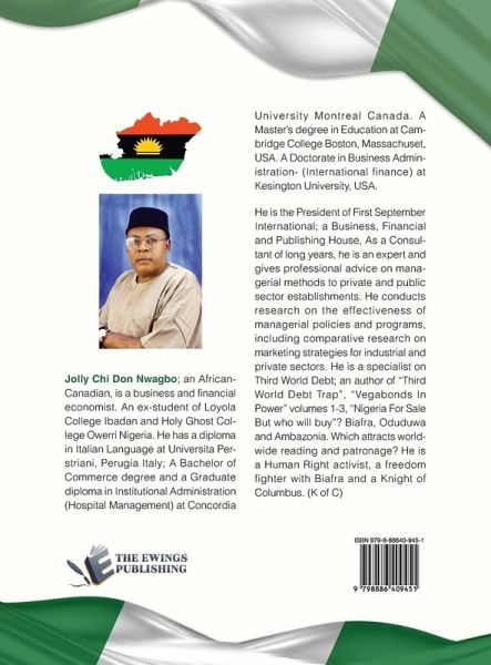 Jolly Chi Don Nwagbo; an African Canadian, is a business and financial economist. An ex-student of Loyola College Ibadan and Holy Ghost College Owerri Nigeria. He has a diploma in Italian Language at Universita Perstrain, Perugia Italy; A Bachelor of Commerce degree, and a Graduate diploma in Institutional Administration (Hospital Management) at Concordia University Montreal Canada. A Master's degree in Education at Cam[1]bridge College Boston, Massachusetts, USA. A Doctorate in Business Administration- (International finance) at Kensington University, USA. He is the President of First September International; a Business, Financial and Publishing House, As a Consultant of long years, he is an expert and gives professional advice on managerial methods to private and public sector establishments. He conducts research on the effectiveness of managerial policies and programs, including comparative research on marketing strategies for industrial and private sectors. He is a specialist on Third World Debt; an author of "Third World Debt Trap", "Vegabonds In Power" volumes 1-3, "Nigeria For Sale But who will buy"? Biafra, Oduduwa and Ambazonia. Which attracts worldwide reading and patronage? He is a Human Right activist, a freedom fighter with Biafra and a Knight of Columbus. (K of C)