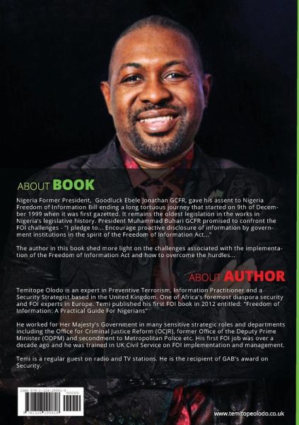 Nigeria Former President, Goodluck Ebele Jonathan GCFR, gave his assent to Nigeria Freedom of Information Bill ending a long tortuous journey that started on 9th of December 1999 when it was first gazetted. President Muhammad Buhari GCFR promised to confront the FOI challenges and said: "I pledge to... Encourage proactive disclosure of information by government institutions in the spirit of the Freedom of Information Act..." The author in this book shed more light on the challenges associated with the implementation of the Freedom of Information Act and how to overcome the hurdles...