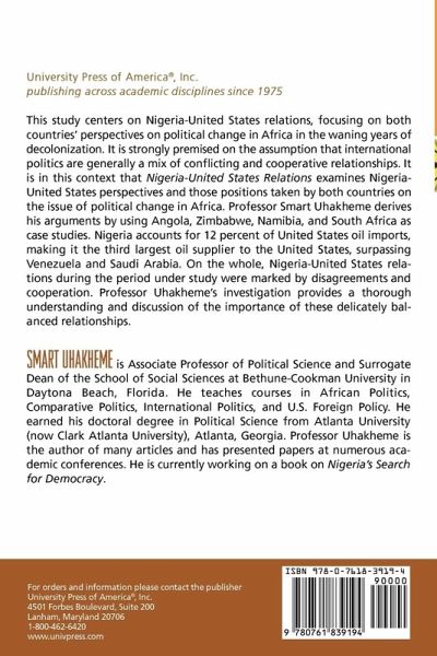 This study centers on Nigeria-United States relations, focusing on both countries' perspectives on political change in Africa in the waning years of decolonization. It is strongly premised on the assumption that international politics are generally a mix of conflicting and cooperative relationships. It is in this context that Nigeria-United States Relations examines Nigeria-United States perspectives, and those positions taken by both countries on the issue of political change in Africa.