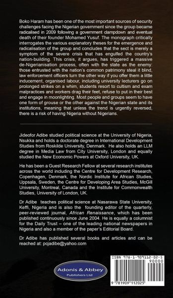 Boko Haram has been one of the most important sources of security challenges facing the Nigerian government since the group became radicalised in 2009 following a government clampdown and eventual death of their founder Mohamed Yusuf. The monograph critically interrogates the various explanatory theses for the emergence and radicalisation of the group and concludes that the sect is merely a symptom of the severe crisis that has engulfed the country's nation-building. This crisis, it argues, has triggered a massive de-Nigerianisation process, often with the state as the enemy: those entrusted with the nation's common patrimony steal it blind, law enforcement officers turn the other way if you offer them a little inducement, organised labour, including university lecturers go on prolonged strikes on a whim, students resort to cultism and exam malpractices and workers drag their feet, refuse to put in their best and engage in moonlighting. Most people and groups seem to have one form of grouse or the other against the Nigerian state and its institutions, meaning that unless the trend is urgently reversed, there is a risk of having Nigeria without Nigerians.