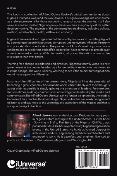 This book is a collection of Alfred Obiora Uzokwe's critical commentaries about Nigeria's triumphs, woes and the way forward. It brings his writings into one volume as a reference material for those conducting research about the country. It will also serve as another tool for Nigeria's policy makers in their everyday quest for better decision-making. The subjects of the commentaries are diverse, including politics, aviation, infrastructure, health, welfare and economy. Nigerians are resilient and ingenious but the country continues to flounder, plagued by poor transportation infrastructure, corruption, unemployment, inflation, insecurity and poor standard of education. The problems of Africa's most populous nation can be traced to rudderless and selfish leaders that have continued to preside over a unidimensional economy. With plummeting oil prices, the nation is now in dire straits more than ever before. Yearning for a change in leadership and direction, Nigerians recently voted in a new government at the center, headed by a former military leader who has vowed to institute change. The world is keenly watching to see if the soldier-turned politician would make a positive difference. In spite of the difficulties of the present time, Nigeria still has the potential of becoming a great economy. Social media where citizens freely vent their thoughts about their leadership is slowly gaining the attention of leaders. Furthermore, the sometimes scathing commentaries about Nigeria's leaders by the media and commentators like Alfred Obiora Uzokwe, can no longer be ignored by the leaders because of their reach in this internet age. Nigerian leaders are slowly being forced to listen to and pay heed to the yearnings and aspirations of the masses and that is a step in the right direction.