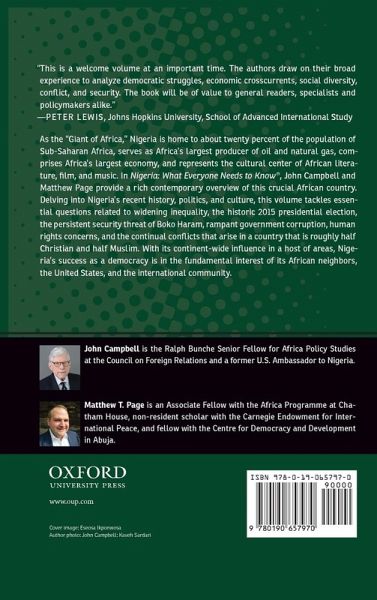 As the "Giant of Africa," Nigeria is home to about twenty percent of the population of Sub-Saharan Africa, serves as Africa's largest producer of oil and natural gas, comprises Africa's largest economy, and represents the cultural center of African literature, film, and music. Yet it is plagued by problems that keep it from realizing its potential as a world power. Boko Haram, a radical, Islamist insurrection centered in the northeast of the country, is a pervasive security challenge, as is the continuous restiveness in the Niger Delta, the heartland of Nigeria's petroleum wealth. The former seeks to destroy the secular Nigerian state; the latter reflects the popular sentiment in the region that the Nigerian people are entitled to a greater share of the wealth it produces. There is also persistent violence associated with land and water use, ethnicity, and religion. In Nigeria: What Everyone Needs to Know®, John Campbell and Matthew Page provide a rich contemporary overview of this crucial African country. Delving into Nigeria's recent history, politics, and culture, this volume tackles essential questions related to widening inequality stemming from Nigeria's oil wealth, its historic 2015 presidential election, the persistent security threat of Boko Haram, rampant government corruption, human rights concerns, and the continual conflicts that arise in a country that is roughly half Christian and half Muslim. With its continent-wide influence in a host of areas, Nigeria's success as a democracy is in the fundamental interest of its African neighbors, the United States, and the international community. This book will provide interested readers with an accessible, one-of-a-kind overview of this significant country.