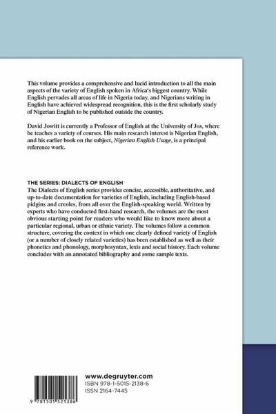 Making use of well-known paradigms, the book will relate Nigerian English, as a 'Second Language' variety, to other World Englishes. Its chief overall concern, however, is to provide a detailed descriptive account of the variety, seeking to show what is distinctive about it and also, in this perspective, distinguishing between more educated and less educated usage. After giving a sociolinguistic profile of Nigeria, where English today enjoys a more prominent role than ever before, it will examine in turn the phonology, morpho-syntax, and lexico-semantics of Nigerian English, with samples of written texts from the eighteenth century to the present. It will also give a comprehensive summary of academic research carried out in the field over the past fifty years.