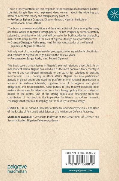 Part 1: Introduction.- Chapter 1: Introduction: understanding Nigeria's foreign policy: reflections on Nigeria's journey so far.- Part 2: The domestic dimensions of Nigeria's foreign policy and external relations.- Chapter 2: Bureaucratic model: the ministry of foreign affairs and Nigerian foreign policy.- Chapter 3: Nigerian foreign policy and challenges of economic development.- Part 3: Afrocentricity and the regional dimensions of Nigeria's foreign policy.- Chapter 4: A critical review of Nigeria's Afrocentric policy: rationale, gains and consequence.- Chapter 5: Natural resource endowment and regional integration in west Africa: the setbacks and implications for Nigerian foreign policy.- Part 4: Nigeria and the global and emerging powers.- Chapter 6: The dynamics and strategic interests in Nigeria-US relations.- Chapter 7: Nigeria-UK relations in the 21st century.- Chapter 8: The foreign policy of emerging big power? Nigeria and china's belt and road initiative.- Chapter 9: Nigeria-South Africa relations: prospects and challenges of a strategic partnership.- Chapter 10: Nigeria-Brazil relations: ties that bind and binds that tie.- Part 5: Contemporary issues and challenges in Nigeria's foreign policy environment.- Chapter 11: Nigeria's foreign policy since independence: problems, challenges and opportunities.- Chapter 12: Nigeria foreign policy in the age of globalization: issues and challenges.- Chapter 13: "Gulliver's Odyssey": assessing Nigeria's role in Ecowas.- Chapter 14: Migration and Nigeria's external relations: a trend analysis of its nature and dynamics in the last 60 years.- Chapter 15: Nigeria's foreign policy and diaspora engagements: the unharnessed strategic asset.- Chapter 16: Climate change and Nigeria's foreign relations.- Chapter 17: Nigeria relations with the organisation of Islamic countries.- Part 6: Conclusion.- Chapter 18: Conclusion: future prospects of Nigeria's foreign policy beyond 60 years of independence: emerging trends and tasks ahead.