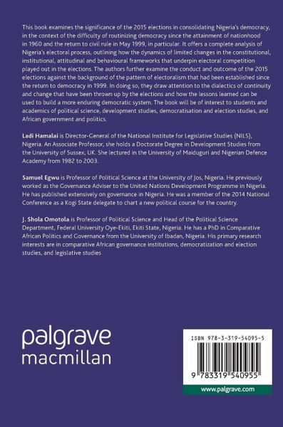 This book examines the significance of the 2015 elections in consolidating Nigeria's democracy, in the context of the difficulty of routinizing democracy since the attainment of nationhood in 1960 and the return to civil rule in May 1999, in particular. It offers a complete analysis of Nigeria's electoral process, outlining how the dynamics of limited changes in the constitutional, institutional, attitudinal and behavioural frameworks that underpin electoral competition played out in the elections. The authors further examine the conduct and outcome of the 2015 elections against the background of the pattern of electoralism that had been established since the return to democracy in 1999. In doing so, they draw attention to the dialectics of continuity and change that have been thrown up by the elections and how the lessons learned can be used to build a more enduring democratic system. The book will be of interest to students and academics of political science, development studies,democratisation and election studies, and African government and politics.