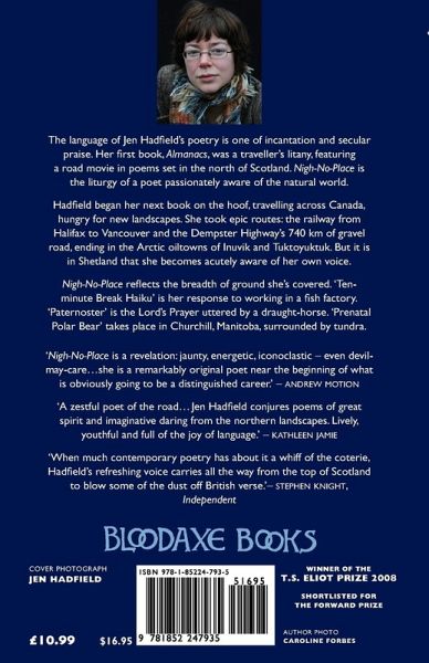 Jen Hadfield lives in Shetland where she works as a poet and writing tutor. Her first collection Almanacs (Bloodaxe Books, 2005) was written in Shetland and the Western Isles in 2002 thanks to a bursary from the Scottish Arts Council, and it won an Eric Gregory Award in 2003, which enabled her to work on her second collection, Nigh-No-Place (Bloodaxe Books, 2008), in Canada and Shetland. She went on to win the T.S. Eliot Prize for Nigh-No-Place, which was also a Poetry Book Society Recommendation as well as being shortlisted for the Forward Prize for Best Collection. She has also received a Dewar Award to produce a solo exhibition of Shetland ex-votos in the style of sacred Mexican folk art, incorporating rubrics of very short fiction, and won the Edwin Morgan Poetry Competition in 2012. Her third collection, Byssus, was published by Picador in 2014.