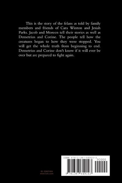 This is the story of the felans as told by family members and friends of Cara Winton and Jesiah Parks. Jacob and Moreen tell their stories as well as Demetrius and Corine. The people tell how the creatures began to how they were stopped. Demetrius and Corine don't know if it will ever be over but are prepared to fight again. (THIS BOOK MAY CONTAIN MATERIAL NOT SUITABLE FOR A YOUNG CHILD. PARENTAL DISCRETION IS ADVISED.)