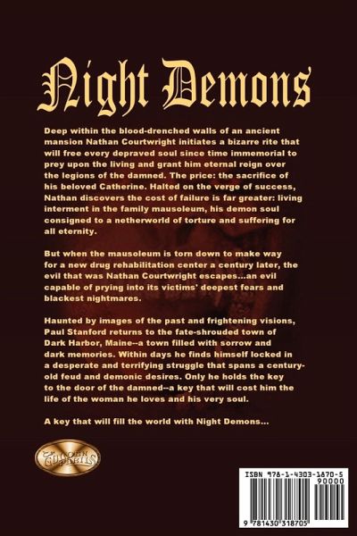 Deep within the blood-drenched walls of an ancient mansion Nathan Courtwright initiates a bizarre rite that will free every depraved soul since time immemorial to prey upon the living. Halted on the verge of success, he discovers the cost of failure is far greater: living interment in the family mausoleum, his demon soul consigned to a netherworld of suffering for all eternity. But when the mausoleum is torn down a century later, the evil that was Nathan Courtwright escapes...an evil capable of prying into its victims' deepest fears and blackest nightmares. Haunted by frightening visions, Paul Stanford returns to the fate-shrouded town of Dark Harbor, Maine--a town filled with sorrow and dark memories. Within days he finds himself locked in a desperate and terrifying struggle that spans a century-old feud and demonic desires. Only he holds the key to the door of the damned-a key that will cost him the life of the woman he loves and his very soul. A key that will fill the world with Night Demons...
