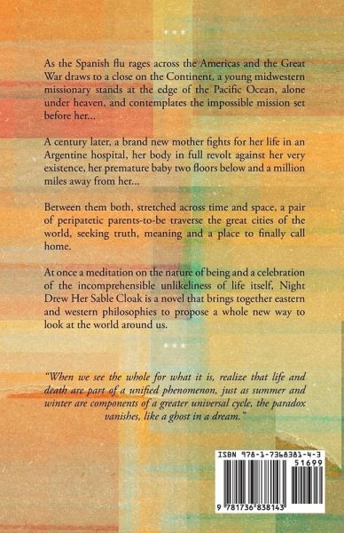 Night Drew Her Sable Cloak weaves together three distinct narratives, following three generations of heroines from the Midwest to the Far East, spanning the width and breadth of the entire 20th Century... As the Spanish flu rages across North America and the Great War draws to a close over on the European continent, a young midwestern missionary stands at the edge of the Pacific Ocean, alone under heaven, and contemplates the impossible mission set before her... A century later, a brand new mother fights for her life in an Argentine hospital, her body in full revolt against her very existence, her premature baby two floors below and a million miles away from her... Between them both, stretched across time and space, a pair of peripatetic parents-to-be traverse the great cities of the world, seeking truth, meaning and a place to finally call home. At once a meditation on the nature of being and a celebration of the incomprehensible unlikeliness of life itself, Night Drew Her Sable Cloak is a novel that brings together eastern and western philosophies to propose a whole new way to look at the world around us.