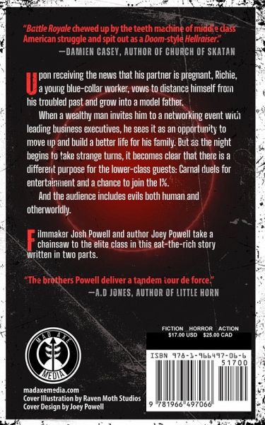 Upon receiving the news that his partner is pregnant, Richie, a young blue-collar worker, vows to distance himself from his troubled past and grow into a model father. When a wealthy man invites him to a networking event with leading business executives, he sees it as an opportunity to move up and build a better life for his family. But as the night begins to take strange turns, it becomes clear that there is a different purpose for the lower-class guests: Carnal duels for entertainment and a chance to join the 1%. And the audience includes evils both human and otherworldly. Filmmaker Josh Powell and author Joey Powell take a chainsaw to the elite class in this eat-the-rich story written in two parts.