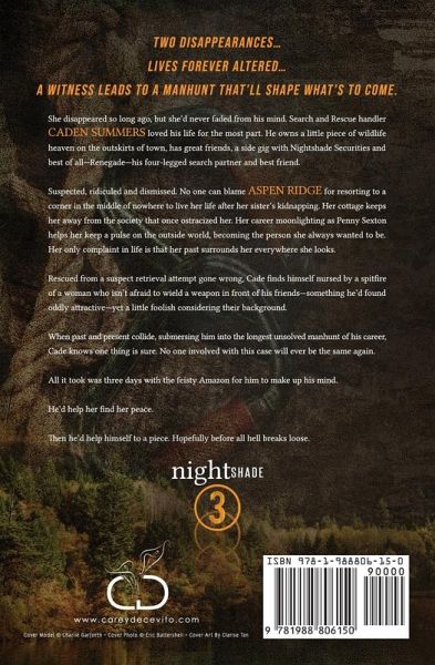 Two disappearances... Lives forever altered... A witness leads to a manhunt that'll shape what's to come. ¿ She disappeared so long ago, but she'd never faded from his mind. Search and Rescue handler Caden Summers loved his life for the most part. He owns a little piece of wildlife heaven on the outskirts of town, has great friends, a side gig with Nightshade Securities and best of all-Renegade-his four-legged search partner and best friend. Suspected, ridiculed and dismissed. No one can blame Aspen Ridge for resorting to a corner in the middle of nowhere to live her life after her sister's kidnapping. Her cottage keeps her away from the society that once ostracized her. Her career moonlighting as Penny Sexton helps her keep a pulse on the outside world, becoming the person she always wanted to be. Her only complaint in life is that her past surrounds her everywhere she looks. Rescued from a suspect retrieval attempt gone wrong, Cade finds himself nursed by a spitfire of a woman who isn't afraid to wield a weapon in front of his friends-something he'd found oddly attractive-yet a little foolish considering their background. When past and present collide, submersing him into the longest unsolved manhunt of his career, Cade knows one thing is sure. No one involved with this case will ever be the same again. All it took was three days with the feisty Amazon for him to make up his mind. He'd help her find her peace. Then he'd help himself to a piece. Hopefully, before all hell breaks loose.