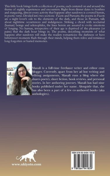 This little book brings forth a collection of poems, each centered on and around the theme of nightly experiences and encounters. Right from dinner dates to bonfires and stargazing, almost every activity that happens after sundown is covered herein, in poetic verse. Divided into two sections- Facets and Pursuits; the poems in Facets are a night lover's ode to the elements of the dark, and those in Pursuits, talk about nighttime occurrences and indulgences. Striking a chord with nocturnal (human) beings and selenophiles, the lines herein are assured to evoke emotions of longing. No human, irrespective of their age is deprived of the pleasures (or pains) that the dark hour brings in. The poems, describing moments of what happens after sundown will make the readers romanticize the darkness or have bittersweet moments flash through their minds, helping them relive and reminisce long forgotten or buried memories.