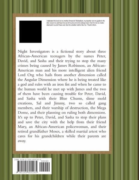 Night Investigators is a fictional story about three African-American children by the names of Peter, David, and Sasha who are trying to solve the many crimes being caused by James Robinson, an African-American man and his more intelligent alien friend Lord Org who hails from another dimension called the Angular Dimension where he rules with an iron fist and the two of them are planning on ruling both dimension with the warship of destruction, the Mega Dome.