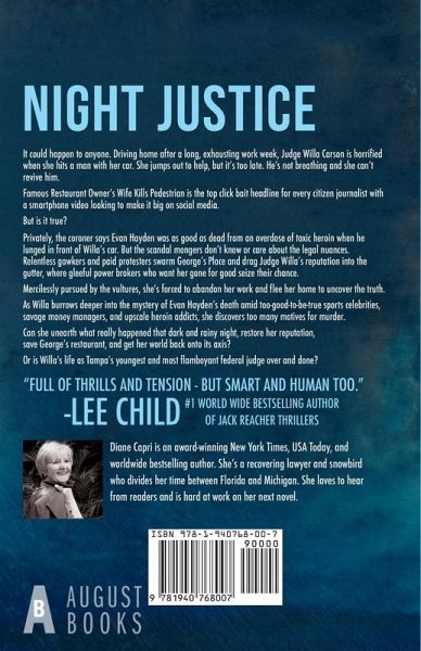 She killed a man. Or did she? USA Todaybestselling Judge Willa Carson returns in this fast-paced mystery filled with great characters, humor, and more twists and turns than a roller coaster. It could happen to anyone. Driving home after a long, exhausting work week, Judge Willa Carson hits a man with her car. She jumps out to help, but it's too late. He's not breathing and she can't revive him. Famous Restaurant Owner's Wife Kills Pedestrianis the top click bait headline for every citizen journalist with a smartphone video looking to make it big on social media. But is it true? Privately, the coroner says Evan Hayden was as good as dead from an overdose of toxic heroin when he lunged in front of Willa's car. But the scandalmongers don't know or care about the legal nuances. Relentless gawkers and paid protesters swarm George's Place and drag Judge Willa's reputation into the gutter, where gleeful power brokers who want her gone for good seize their chance. Mercilessly pursued by the vultures, she's forced to abandon her work and flee her home to uncover the truth. As Willa burrows deeper into the mystery of Evan Hayden's death amid too-good-to-be-true sports celebrities, savage money managers, and upscale heroin addicts, she discovers too many motives for murder. Can she unearth what really happened that dark and rainy night, restore her reputation, save George's restaurant, and get her world back onto its axis? Or is Willa's life as Tampa's youngest and most flamboyant federal judge over and done? If you like to read a twisty, clever "who done it" that will have you scratching your head until the end is revealed, Night Justiceand Judge Willa Carson are for you. Start reading now and you'll be glued to the page! "Intricate and ingenious - make some coffee, because you'll read all night." Lee Child, #1 Worldwide Bestselling author of Jack Reacher thrillers