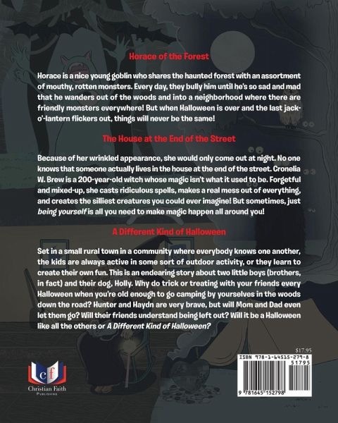 Horace of the Forest Horace is a nice young goblin who shares the haunted forest with an assortment of mouthy, rotten monsters. Every day, they bully him until he's so sad and mad that he wanders out of the woods and into a neighborhood where there are friendly monsters everywhere! But when Halloween is over and the last jack-o'-lantern flickers out, things will never be the same! The House at the End of the Street Because of her wrinkled appearance, she would only come out at night. No one knows that someone actually lives in the house at the end of the street. Cronelia W. Brew is a 200-year-old witch whose magic isn't what it used to be. Forgetful and mixed-up, she casts ridiculous spells, makes a real mess out of everything, and creates the silliest creatures you could ever imagine! But sometimes, just being yourself is all you need to make magic happen all around you! A Different Kind of Halloween Set in a small rural town in a community where everybody knows one another, the kids are always active in some sort of outdoor activity, or they learn to create their own fun. This is an endearing story about two little boys (brothers, in fact) and their dog, Holly. Why do trick or treating with your friends every Halloween when you're old enough to go camping by yourselves in the woods down the road? Hunter and Haydn are very brave, but will Mom and Dad even let them go? Will their friends understand being left out? Will it be a Halloween like all the others or A Different Kind of Halloween?