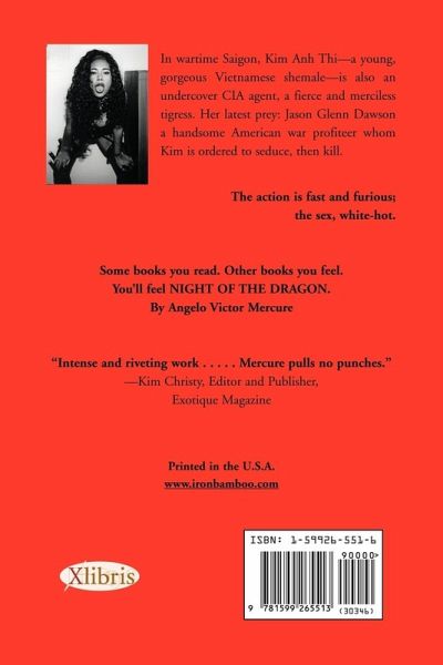 In wartime Saigon, Kim Anh Thi - a young, gorgeous Vietnamese shemale - is also an undercover CIA agent, a fierce and merciless tigress. Her latest prey: Jason Glenn Dawson a handsome American war profiteer whom Kim is ordered to seduce, then kill. The action is fast and furious; the sex, white-hot. Some books you read. Other books you feel. You'll feel NIGHT OF THE DRAGON. By Angelo Victor Mercure 'Intense and riveting work . . . . . Mercure pulls no punches." Kim Christy, Editor and Publisher, Exotique Magazine Printed in the U.S.A. (c) 2004 Angelo V. Mercure All Rights Reserved www.ironbamboo.com